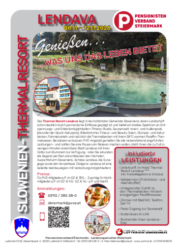 Das Thermal Resort Lendava liegt in der östlichsten Gemeinde Sloweniens, deren Landschaft schon deutlich durch pannonische Einflüsse geprägt ist und bietet ein breites Spektrum an Entspannungs- und Erlebnismöglichkeiten: Fitness-Studio, Saunawelt, Innen- und Außenpools (darunter der Geysir-Naturpool), Billardzimmer, Friseur- und Beautysalon, Olympia- und Naturbecken, Fahrradverleih und natürlich die Thermalbecken mit ihrem 38°C warmen Paraffin-Thermalwasser. Bei diesem exklusiven PVÖ-Angebot genießen Sie alle nebenstehend angeführten Leistungen - und sollten Sie eine Pause vom Relaxen machen wollen, steht Ihnen die zu Fuß in wenigen Minuten erreichbare Stadt Lendava mit ihren Cafés zum Bummeln zur Verfügung. Übrigens: Lendava ist eine geschätzte Weinbauregion und es gibt viele Verkostungsmöglichkeiten!