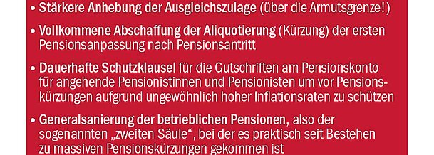 Wir treten mit voller Kraft für die Sicherung der staatlichen, umlagenfinanzierten Pension ein, die sich immer wieder als krisenfest, verlässlich und alternativlos erwiesen hat! Unsere klare Forderung zu den jährlichen Pensionanpassungen lautet: Die Sicherung der Kaufkraft aller Pensionist*innen und die Bekämpfung der Altersarmut. Es braucht Pensionen, von denen man auch gut leben kann! Der Lebensstandard muss auch in der Pension gesichert und erhalten bleiben!
