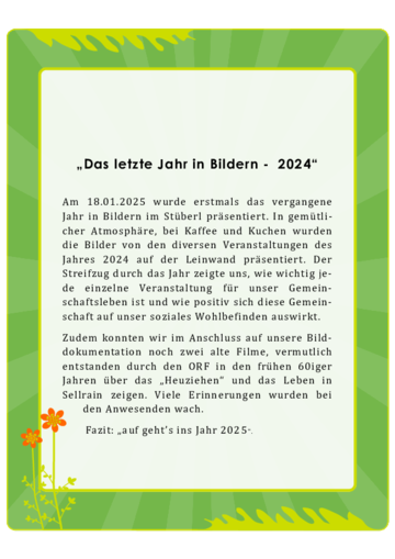 Am 18.01.2025 trafen sich die SeniorInnen des Sellraintales um das vergangene Jahr Revue passieren zu lassen. Es wurden Bilder der Veranstaltungen aus dem Jahr 2024 und zwei alte Filme über das Leben im Tal gezeigt.