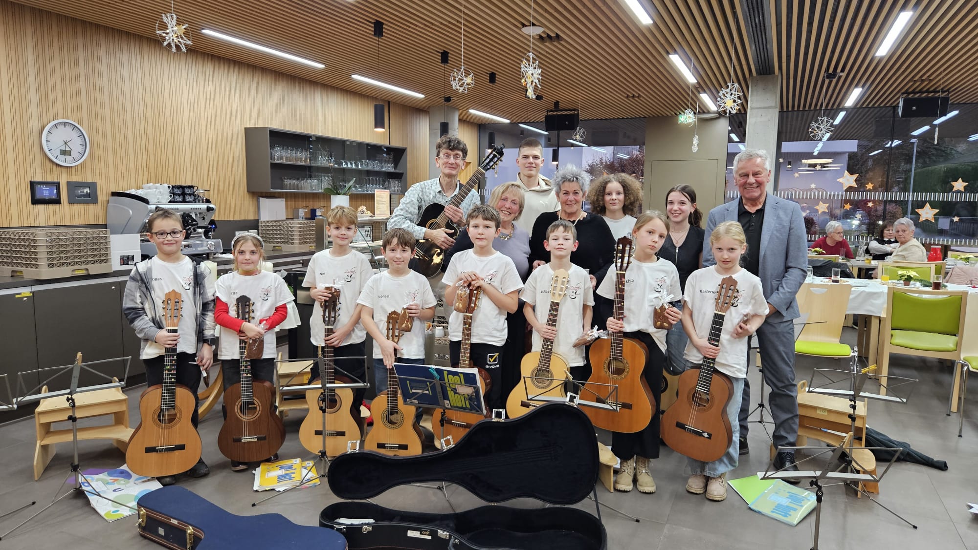 Nach den Ansprachen der Ehrengäste, die den Zusammenhalt und die Leistungen des Vereines würdigten und dem ausführlichen Bericht des Bürgermeisters über den Bahnhof -Umbaubeginn, Bericht über die volle Auslastung des Hauses der Gesundheit und Verlagerung der Beratungsstelle nach Moosau 7 sowie weitere geplante Vorhaben der Gemeinde für das nächste Jahr, führte uns Obfrau Maria Niederwieser und ihr Team, in gewohnter Weise, mit ihren weihnachtlichen Kurzgeschichten und Erzählungen durch den besinnlichen Nachmittag. Musikalisch umrahmt wurde die Feier von der zehnköpfigen Gitarrengruppe der Musikschule Völs unter ihrem Lehrer und Leiter Wolfgang Schmitt, die mit ihren Gitarrenklängen und Adventliedern, zum Mitsingen, zur harmonischer Stimmung beigetragen haben. Auch für das leibliche Wohl mit Kaffee, Kuchen, Kekse und Getränken war bestens gesorgt.