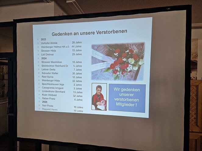 Die Obfrau Christa Gangl freute sich über das große Interesse der Mitglieder und begrüßte auch den Landespräsidenten Herbert Striegl und den Gemeindevertreter Vzbgm. Robert Peer bei der JHV. Der Tätigkeitsbericht wurde per Power Point interessant und kurzweilig präsentiert.