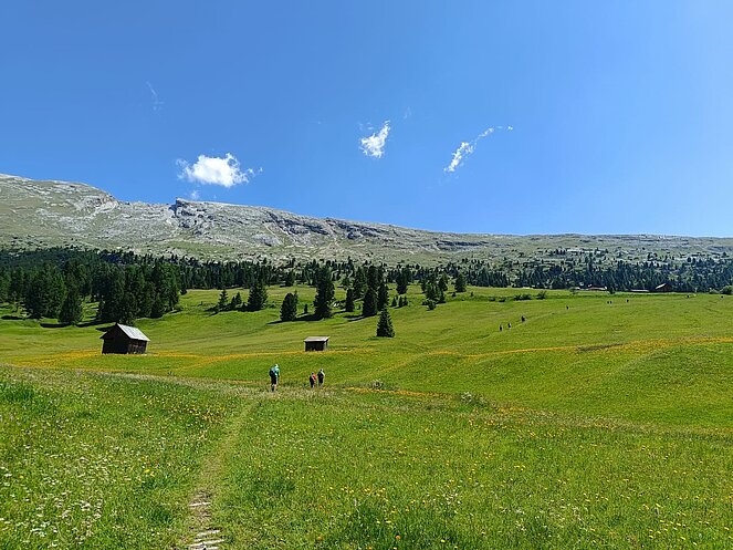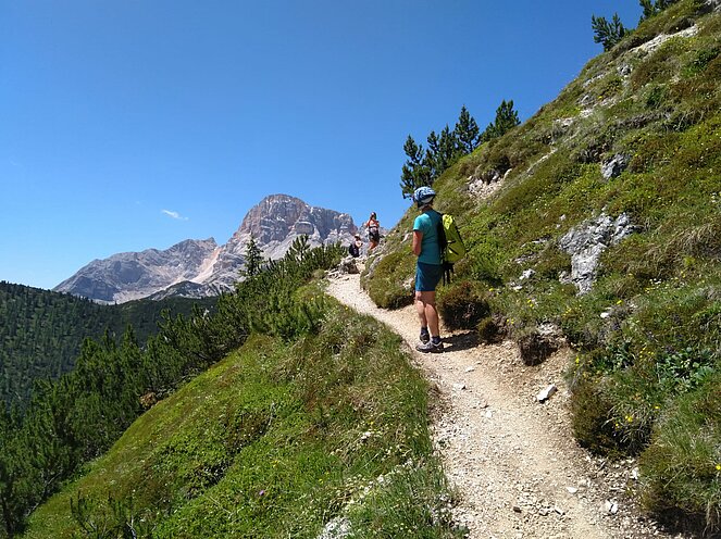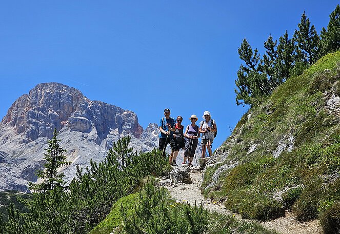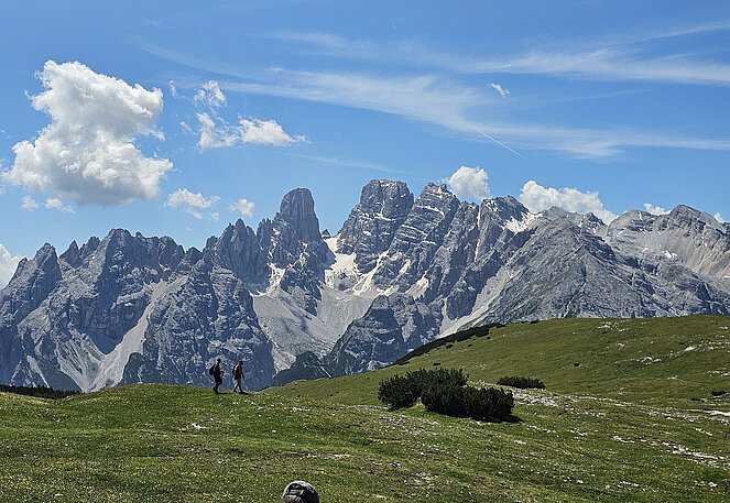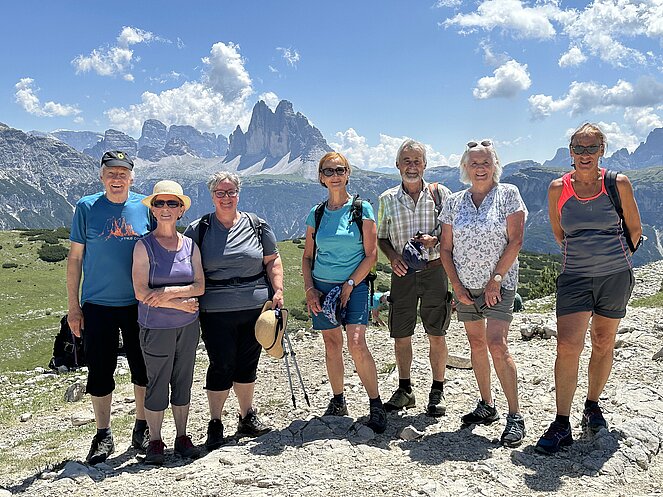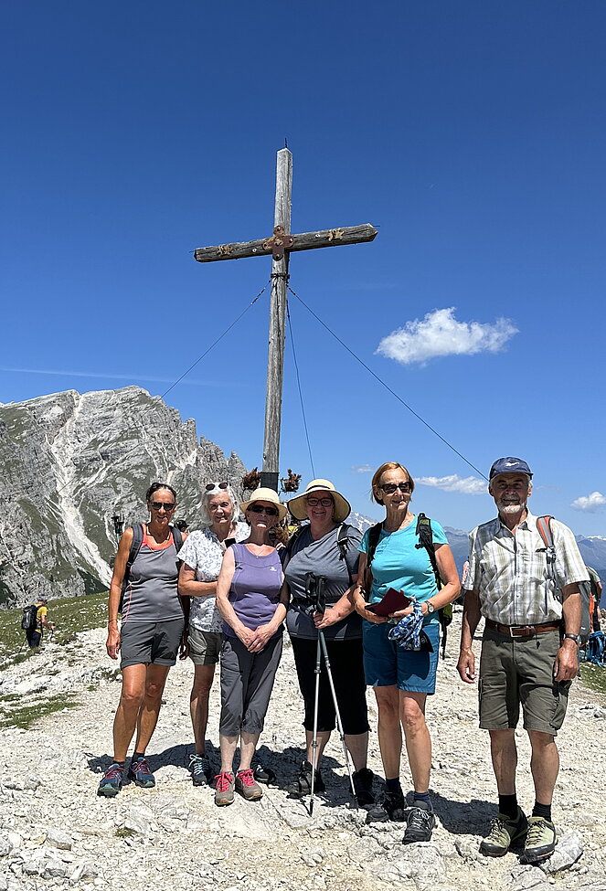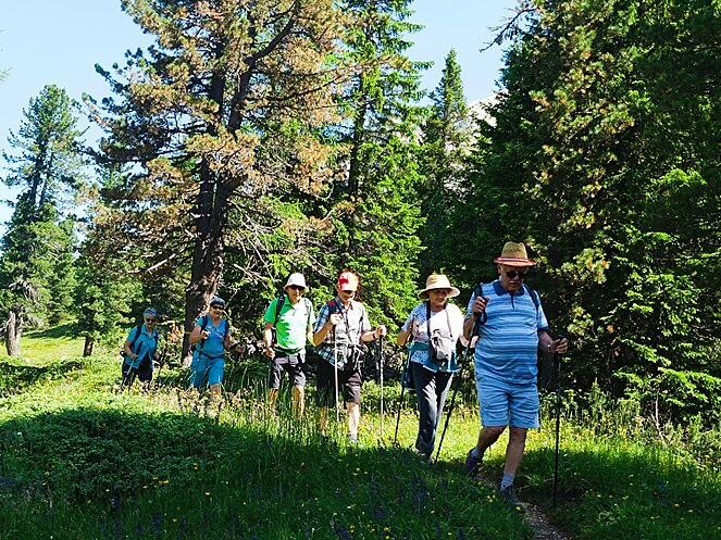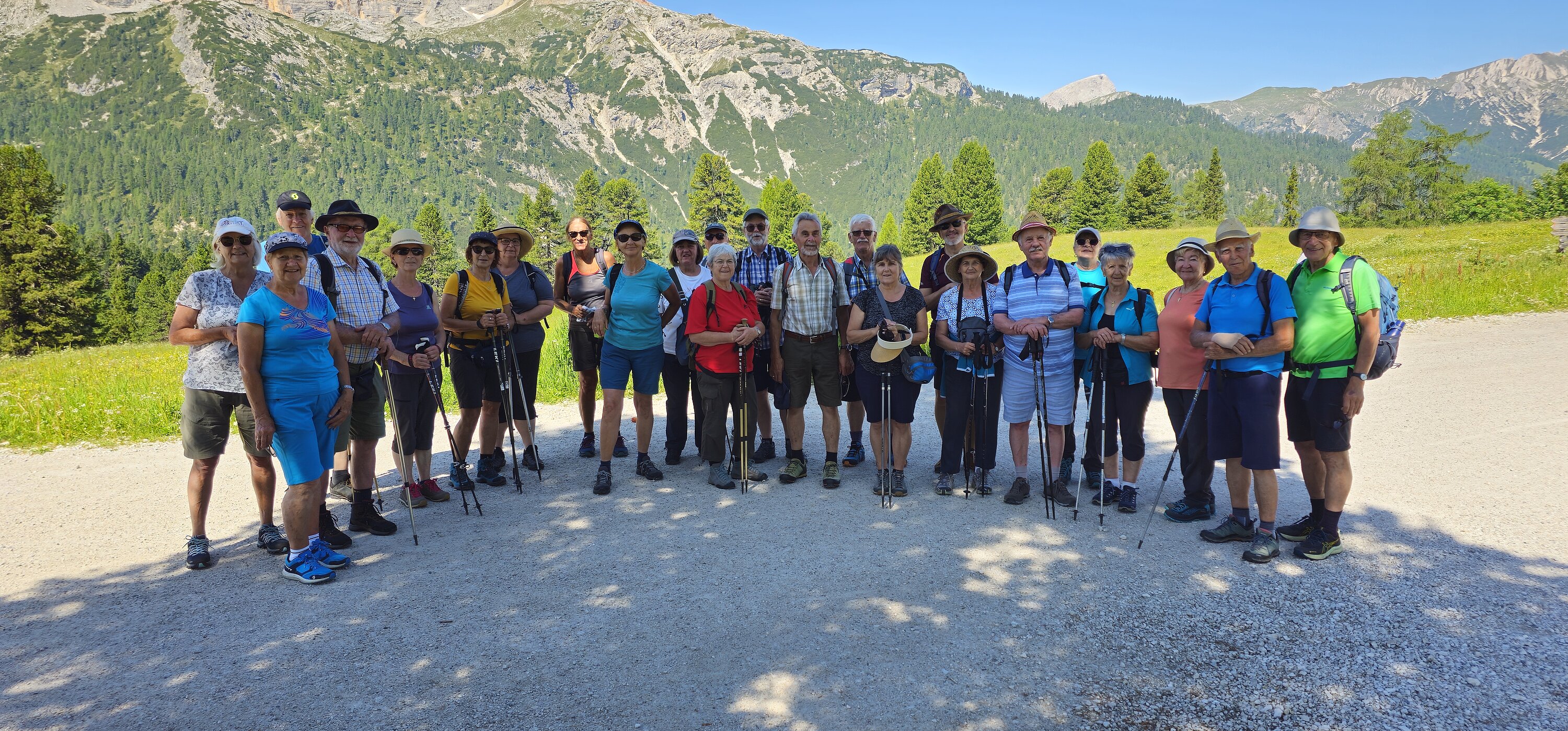 Das Ziel war die Plätzwiese, eine Hochfläche, die für ihren Blumenreichtum und ihr unvergleichliches Panorama inmitten der Sextener Dolomiten berühmt ist. Der Ausgangspunkt der Wanderung liegt bereits auf 2000 Meter Seehöhe, somit war es nicht so brütend heiß wie im Tal. Der Großteil der Gruppe wanderte über die Stolla-Alm und durch die Kassler Wiese bis zur Dürrensteinhütte. Eine 7-köpfige Gruppe bestieg in einer leichten, 2-stündigen Wanderung den Strudelkopf, der einen unvergleichlichen Rundblick bietet. Den schmalen, teils felsdurchsetzten Abstieg zur Dürrenstein-Hütte schafften die Goggsteig-erprobten SeniorInnen ohne Probleme. In der gut geführten Hütte trafen alle zu einer verdienten Stärkung wieder zusammen, bevor es zurück zum Parkplatz ging.