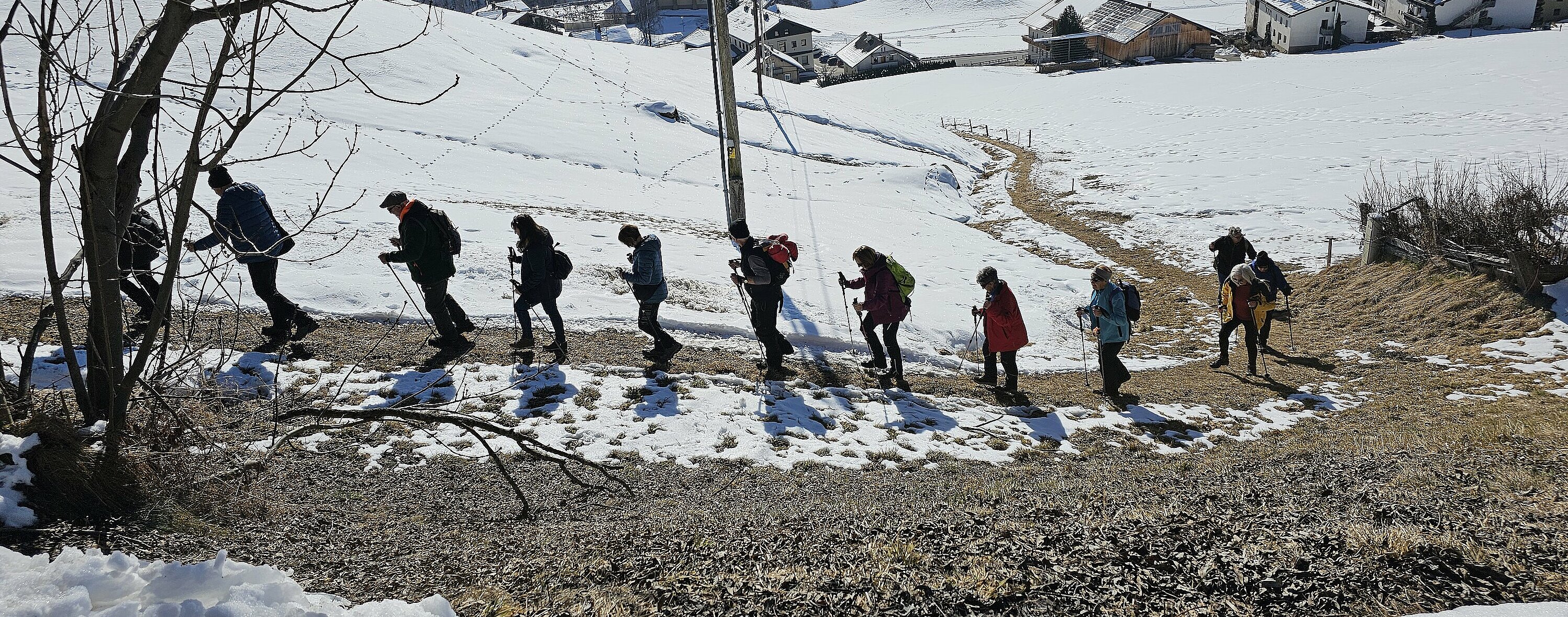 Um die Winterruhe zu beenden, begaben sich 20 wanderlustige Leisacher PensionistInnen ins Winterwanderdorf Kartitsch. Die abwechslungsreiche Wanderung führte vom Parkplatz bei der Kirche aus über den sonnigen Künstlerweg zuerst steil und dann gemütlich bis nach Sankt Oswald. Dort war nach einem Besuch im wohl schönstgelegenen Friedhof Osttirols eine Einkehr im Gasthof Dorfberg fällig. Auch auf dem Rückweg begleitete uns noch die Sonne und sorgte für gute Laune. Der Künstlerweg verdankt seinen Namen mehreren am Wegrand aufgestellten Tafeln mit Gemälden des berühmten Malers Oswald Kollreider, an dessen Geburtshaus der Weg vorbeiführt.