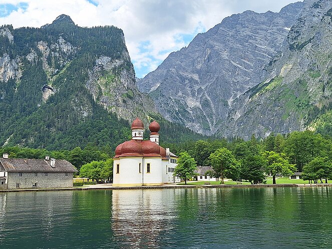 Der Königssee ist ein Gebirgssee in der Gemeinde Schönau am Königssee im Landkreis Berchtesgadener Land. Eingebettet zwischen den steilen Berghängen von Watzmann und Hagengebirge hat der langgestreckte See zusammen mit dem südöstlich vorgelagerten kleineren Obersee – um den das Steinerne Meer den Talabschluss bildet – einen fjordartigen Charakter. Er gehört zu den saubersten Seen Deutschland.