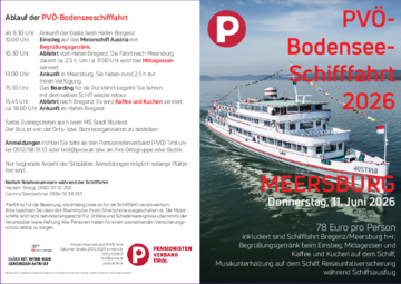 Der Pensionistenverband Tirol lädt zur Schiffsfahrt auf dem Bodensee ein! Mit dem Motorschiff MS Austria erleben unsere Mitglieder einen wunderschönen Ausflugstag unter Freunden mit Musik, gutem Essen und buntem Programm. Wir freuen uns, dass du mit uns deine Freizeit genießt!