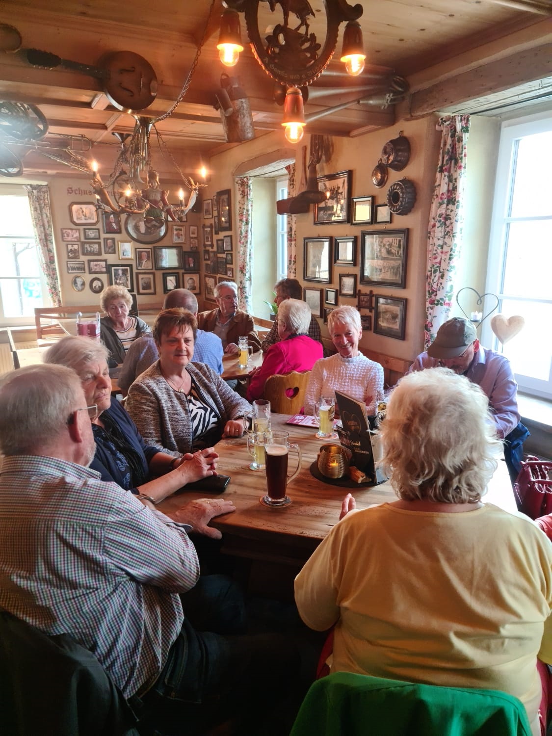 Eine andere Art der Kulinarik bot sich dann beim Ritteressen in Aulendorf. Stimmungsvoll nach Art des Mittelalters wurden Speisen und Getränke dargeboten. Unsere Pensionisten waren ganz begeistert. Ein sehr grosses Flädle musste von Hand zum Mund geführt werden und Brühe nachgeschlürft. Nur ein Messer war laut dem führenden Ritterknappen zum Essen erlaubt. Die Magd schenkte nach der Händewaschung Met, Bier und Wein nach. Mit vollen Bäuchen ging es mit Gesang und guter Laune heimwärts.