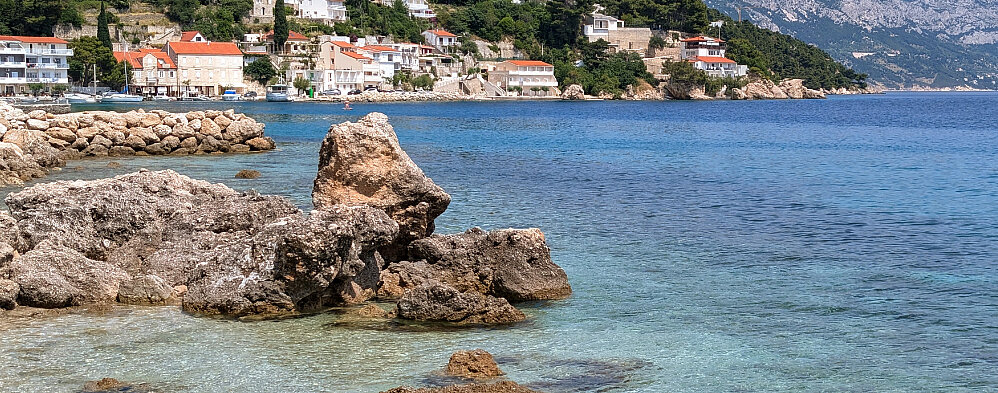 Tauchen Sie ein in die Schönheit der dalmatinischen Riviera: glasklares Wasser, malerische Kieselstrände und dicht bewachsene Künstenhänge laden zum Entspannen, Schwimmen oder Sonnenbaden ein.