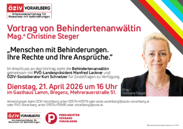 Im Anschluss an den Vortrag steht die Behindertenanwältin gemeinsam mit PVÖ-Landespräsident Manfred Lackner und ÖZIV-Sozialberater Kurt Schnetzer für Einzelfragen zu Verfügung.
