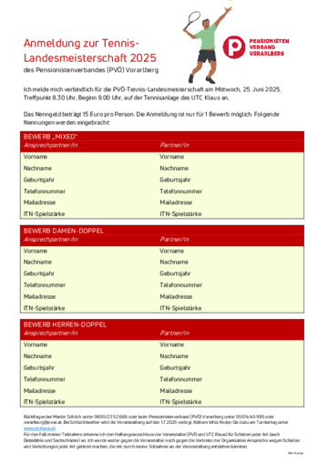 Anmeldungen nehmen der Pensionistenverband (PVÖ) Vorarlberg bis zum 18. Juni 2025 um 12.00 Uhr unter Tel. 05574/45995, vorarlberg(at)pvoe.at oder bei PVÖ-Landestennisreferentin Alexandra Helbok unter v.tennis(at)pvoe.at oder alexandra.helbok(at)gmx.at entgegen.