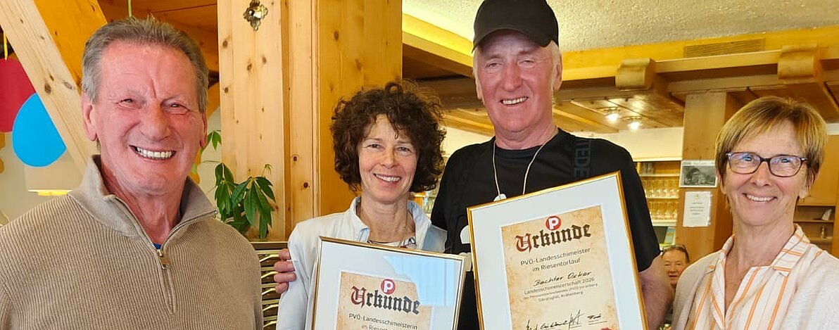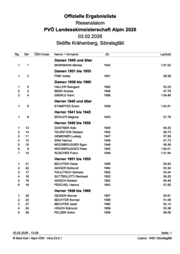 Reingard Haller, bei den Damen, und Oskar Bechter, bei den Herren, holten die RTL-Titel bei den Landesskimeisterschaften des Pensionistenverbandes (PVÖ) Vorarlberg in Sibratsgfäll. Auf der Riesentorlauf-Piste am Krähenberg hatte der WSV Sibratsgfäll als durchführender Verein wieder für beste Pistenverhältnisse gesorgt. Besonders freuten sich die PVÖ-Schifahrer auf einen winterlichen Tag bei Kaiserwetter. So stand tollen Wettkämpfen, der anschließenden Preisverleihung im „Hirschen“ und den musikalischen Ausklang, nichts mehr im Weg.