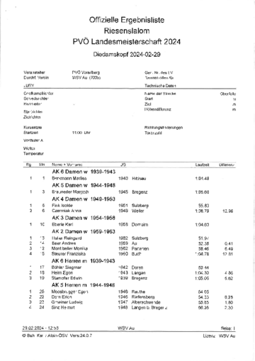 Bei Kaiserwetter eröffnete der Ortschef des Pensionistenverbandes (PVÖ) Hinterwald, Traugott Muxel, die Landesschimeisterschaft im RTL auf dem Diedamskopf. In insgesamt 10 Altersklassen fuhren die Damen und Herren um die PVÖ-Medaillen. Den Landesmeistertitel bei den Damen holte sich Reingard Haller mit einer Zeit von 51,97. Bei den Herren krönte sich Konrad Bechter in 49,72 zum Meister. Auszeichnungen für die ältesten Teilnehmer überreichte PVÖ-Wintersportreferent Bruno Geiger an Marlies Berkmann und Edwin Stampfer, der mit bald 85 Jahren noch tolle Ergebnisse bei Schirennen erzielt.