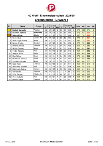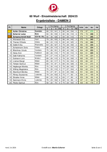 Bei den Damen 1 krönte sich die Vandanserin Manuela Zudrell mit 275 Kegel zur Landesmeisterin. Platz 2 ging an die Höchsterin Monika Schobel und Bronze an Hilde Bösch aus Götzis. Bei den Damen 2 trumpfte Christine Kofler von den Dornbirner PVÖ-Keglern mit 275 Kegel auf. Luise Scherrer und Heidi Schaarschmidt sicherten sich die weiteren Topplatzierungen.