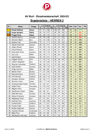 Gold ging bei Herren 1 an Niki Herceg mit 272 Kegel. Silber errang Markus Riedmann von Mäder und Bronze an Edi Wiesflecker vom Wolfurter Team. Bei den Herren 2 war der Götzner Wilfried Pürstl das Maß aller Dinge. Mit 277 Kegel gewann er den prestigeträchtigen Einzelmeistertitel bei den Herren. 2. Platz ging an Heribert Kodal und Franz Brugg, beide von den Nofler PVÖ-Keglern.