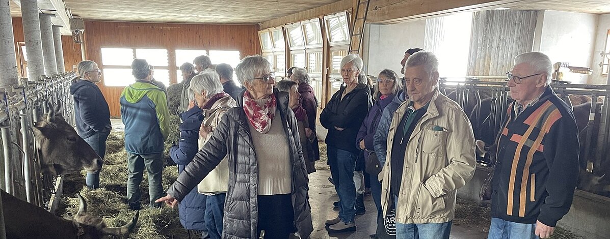 Der Ausflug des Pensionistenverbandes (PVÖ) Altach führte in den tief verschneiten Bregenzerwald nach Doren. Herzlich wurden wir von Agathe und Karl Lingenhel begrüßt. Nach einer kurzen Einführung über biologische Landwirtschaft und über die Bedeutung von „Demeter“, ging es in den Stallbereich. Hier wurde uns erklärt, welche Rolle es spielt, mit dem Kreislauf der Jahreszeiten, dem Respekt vor den Tieren und der Art der Fütterung zu leben, damit ein gesundes Naturprodukt entstehen kann. Im Anschluss an die eindrucksvolle Führung gab es eine großartige Jause. Agathe und Karl tischten uns gemeinsam mit ihrer Tochter ein beeindruckendes, liebevoll angerichtetes Buffet auf, bei dem es an nichts fehlte. Wir wurden mit selbstgebackenen Broten, Aufstrichen, Salaten und Varianten vom Rind, bis hin zu Käse, Joghurts und süßem Gebäck verwöhnt. Nach dem Gaumenschmaus in der gemütlichen Stube konnte sich wer wollte im hofeigenen Laden allerlei Schmankerln mit nach Hause nehmen. Beeindruckt von der Führung und der Gastfreundschaft der Familie „Lingenhel“, ging es dann gestärkt über Langen und Bregenz wieder zurück nach Altach.
