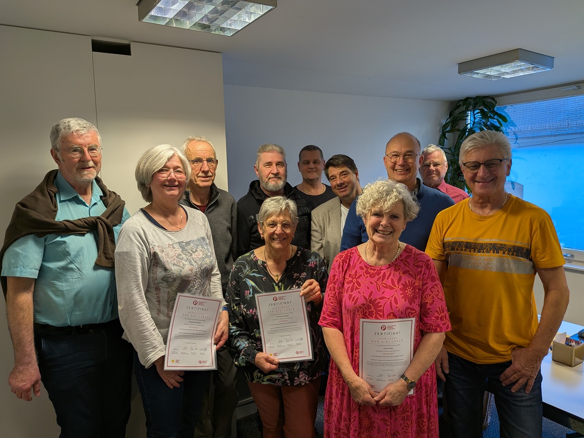 Zeitgerecht zu Beginn der Steuererklärungszeit, schlossen die „digitalen Alltagshelfer“ des Pensionistenverbandes (PVÖ) Vorarlberg ihre Ausbildung zum „Digi Coach“ ab. Sie erhielten von Geschäftsführer Hubert Lötsch die Zertifikate für die mehrmonatige Ausbildung in zentralen Smartphone- und PC-Themen. Damit stehen die Ehrenamtlichen nicht nur für Onlinedienste wie ID Austria, Finanzonline mit 2-Faktorenauthentifizierung, der Eingabe von Förderungen wie der „Geräte-Retter-Prämie“, sondern auch für Hilfen bei technischen Anliegen zur Verfügung.