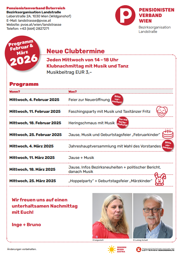 Klubnachmittage mit Musik und Tanz finden an unserer ***neuen Adresse: LEBERSTRASSE 2A, 1030 WIEN*** statt: