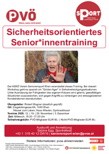 Der ASKÖ Verein Seniorensport Wien veranstaltet dieses Training. Bei diesem Workshop geht es speziell um "Golden Ager" in Selbstverteidigungssituationen. Unter Ausnützung der Fähigkeiten des eigenen Körpers wird gelernt, gewalttätigen Situationen auszuweichen, sich gegen Angriffe zu verteidigen und stressgeladenen Situationen standzuhalten.