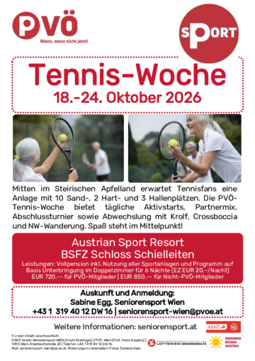Wir freuen uns auch heuer wieder eine Tenniswoche mit anderen Tennisbegeisterten im wunderschönen Austrian Sport Resort BSFZ Schloss Schielleiten anbieten zu können. Der wunderschöne Standort mitten in der Steiermark, eingebettet im Steirischen Apfelland, bietet für Tennisbegeisterte 10 Sandplätze, 2 Hartplätze - im Freien - und 3 Hallenplätze. Abschließend veranstalten wir ein Turnier, bei dem der Spaß im Vordergrund steht.