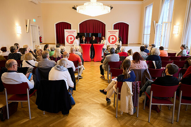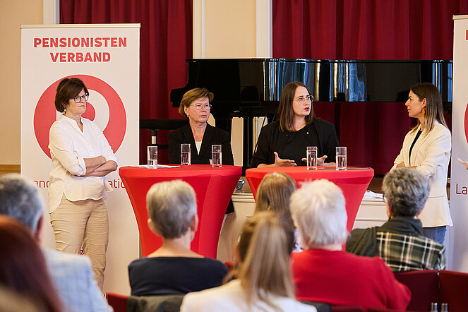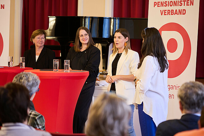 Unter der Leitung der Landesgeschäftsführerin Michaela Sramek diskutierten Petra Draxl, Vorständin AMS Österreich, Julia Pfneißl-Mauritz, Unternehmerin und Geschäftsführerin von Future Link sowie Ilse Fitzbauer, Gemeinderätin außer Dienst und Präsidiumsmitglied des PVÖ-Wien und Marina Hanke, Landtagsabgeordnete und Wiener Gemeinderätin, dieses generationenübergreifende seit vielen Jahren evidente Thema.