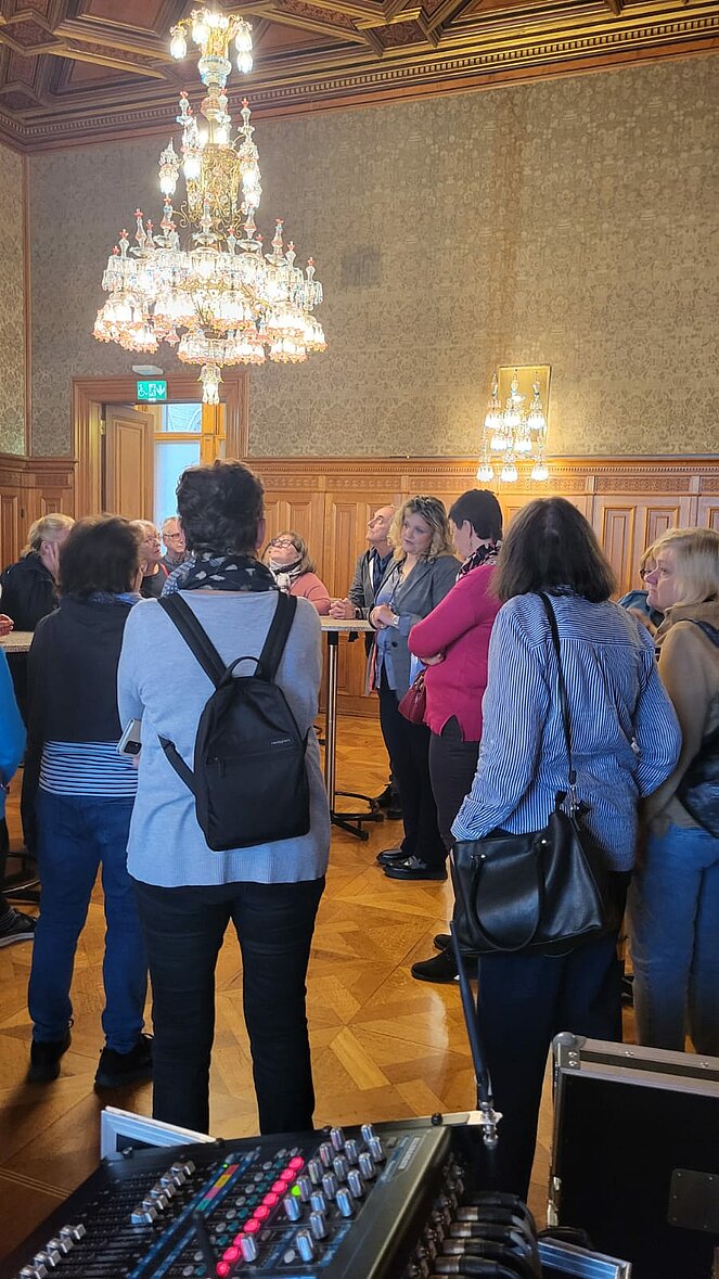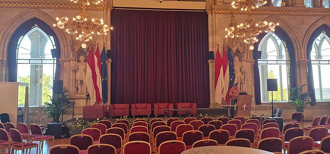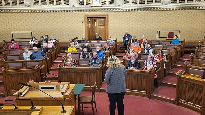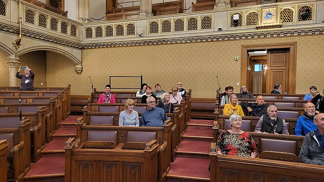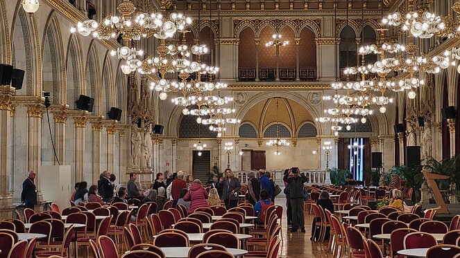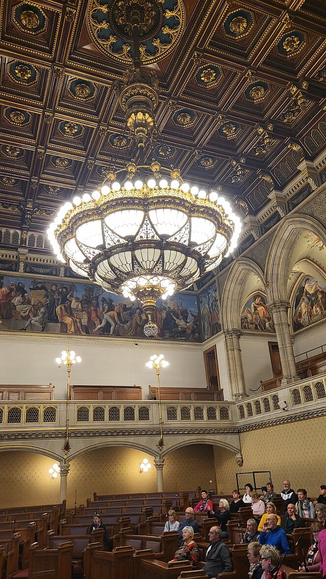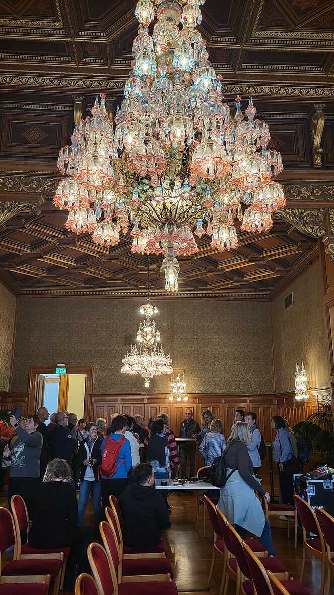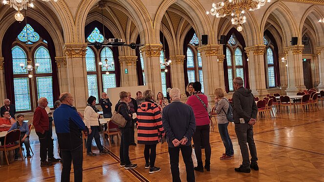 Rund 40 Interessierte nahmen an der Sonderführung des PVÖ-Wien teil. Zu Beginn begrüßte der Wiener Landtagspräsident Christian Meidlinger die Teilnehmenden und hieß sie herzlich willkommen. Eine Mitarbeiterin des Wiener Rathauses führte im Anschluss die Gruppe durch das Gebäude. Die Gäste erhielten einen informativen und zugleich unterhaltsamen Einblick in die Geschichte, Architektur und die Arbeitsweise des Hauses.